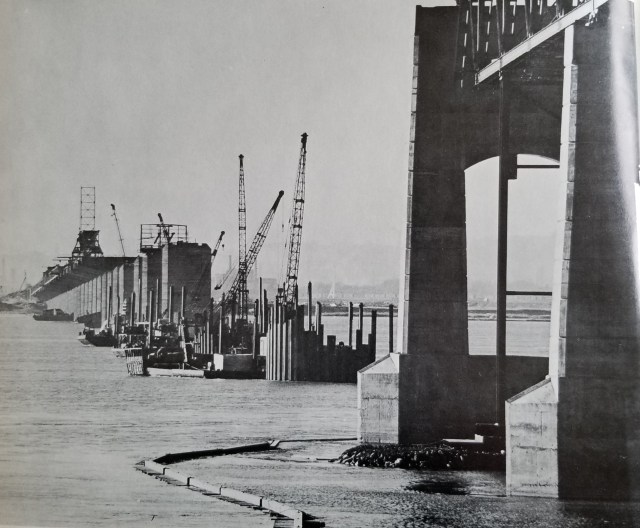 Il y a quelques semaines, le pont Champlain faisait les manchettes: en piteux état, il inquiète tout le monde… Ce pont a eu 50 ans en 2012. Lorsque sa construction a été complétée en 1962, au coût de 35 millions de dollars, sa présence a changé le visage de Montréal et en particulier, celui de l’île des Soeurs. Un ouvrage a été publié en 1962 par Porcupine Publishing sous le nom de The Champlain Bridge et c’est un recueil assez impressionnant qui montre en détail la naissance du pont Champlain, tel que photographié par Hans Van Der Aa. Les photos ci-dessous sont extraites de cet ouvrage.