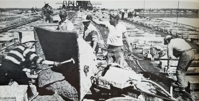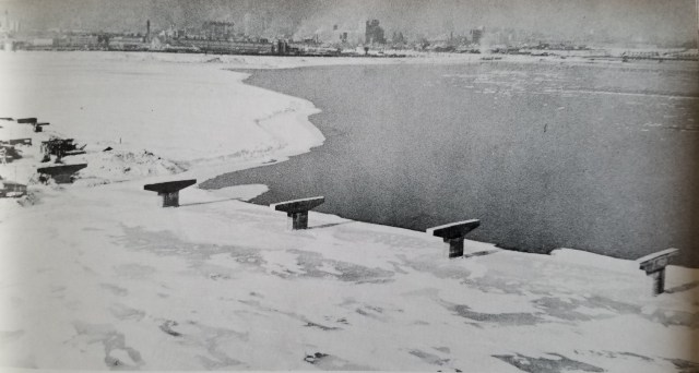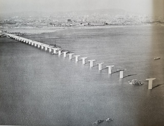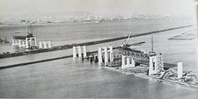 La première image que je trouve particulièrement fascinante se trouve ci-dessous, et elle montre l’impact de ce pont sur l’île des Sœurs. Cette île, aussi connue sous le nom d’île Saint-Paul, était la propriété de sœurs de la Congrégation Notre-Dame depuis les années 1700, et ce jusqu’en 1957. Ces terres étaient toutes vouées à l’agriculture, pour fournir la communauté en denrées comestibles. La suite est assez triste: le manoir des sœurs, abandonné depuis 1957, a brûlé en 1960; plusieurs lieux de cette île ont été nivelés et remblayés par des roches et des ordures provenant de Verdun; finalement, plusieurs bâtiments de type « tour » ont été érigés, donnant l’aspect actuel aux lieux. On voit, sur la photo ci-dessous, un genre de voie d’accès temporaire créée par un remblai de pierre qui traverse le bras du fleuve entre Verdun et l’île des Sœurs…