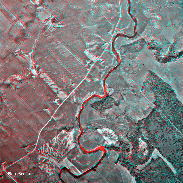 Pour me documenter, je parcours le web et je trouve cette photo qui montre les traces de ce glissement de terrain, prise en 1955, et tirée des travaux de Pierre Bédard du département de génie géologique à l’École Polytechnique de Montréal. Il s’agit en fait d’un anaglyphe, donc on peut le regarder avec des lunettes 3D pour mettre en valeur le relief…!