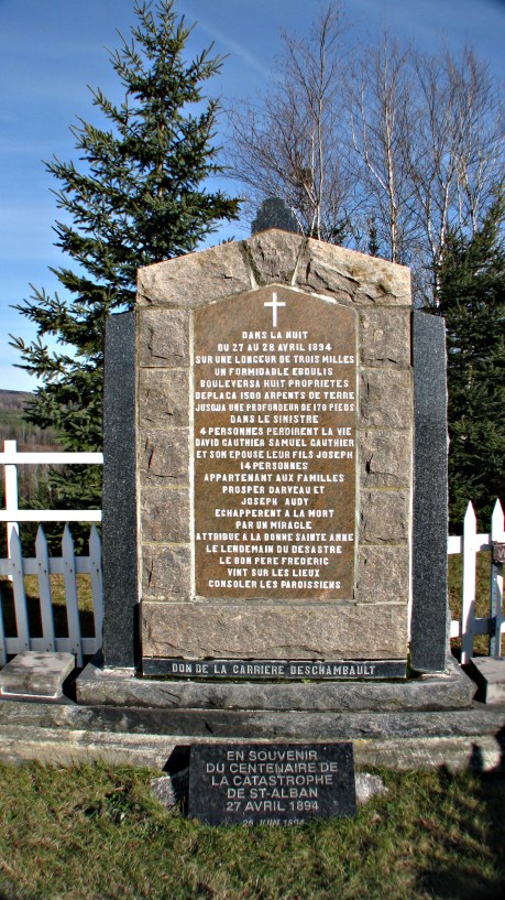 Quelques instants après, la masse de terre s’est mise en mouvement et est descendue vers le village de Saint Albans (sic) entraînant le pont avec elle. L’eau au village a monté de 4 pieds au-dessus du pont qui était de 75 pieds au-dessus du lit de la rivière.
