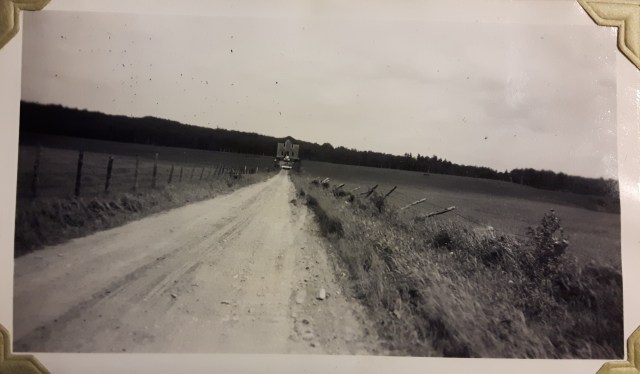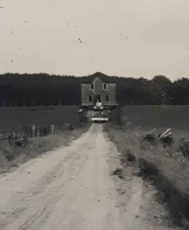 J’ai finalement trouvé une photo documentant les déménagements de maison que mon grand-père effectuait… et cette photo représente non le moindre des déménagement de maison. Il s’agit du déménagement de la maison des Duquette à Saint-Placide-de-Béarn, une maison de deux étages. Sur la photo, on note plusieurs choses: d’abord, le camion qui transporte la maison; ensuite, le fait qu’elle soit précédée d’un bulldozer; enfin, la clôture couchée du côté gauche du champ, afin de laisser passer la maison.