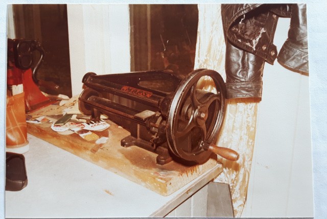 L’outil principal du cordonnier, c’est le moulin. Monsieur Douaire préfère de loin le moulin à pédales qui permet un meilleur contrôle de la vitesse d’exécution.